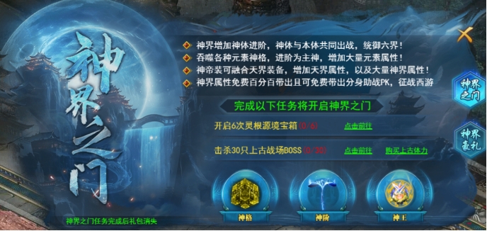 开启条件:开服满120天且修真等级满40重开启神界之门,完成开门任务即可开启神界之门。