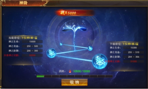 吸纳神元可升级神阶位级,获得大量神界属性,神界越高可进入的地图层数和副本层数越高。