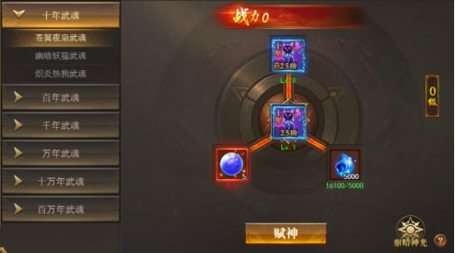 穿戴对应年限的武魂后,可消耗对应年限赋神材料(光明、黑暗神殿获取)和万物源气(荒古神迹、五行源地获取)对其进行赋神,获取大量神界属性!
