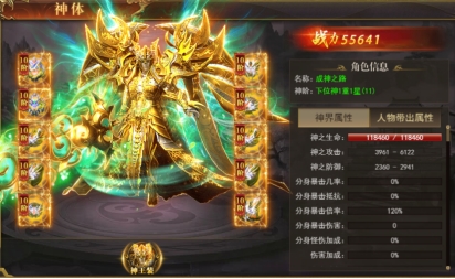 神王分身会跟随本体作战,左侧边栏会显示神界属性与分身状态,进入神界时默认显示神王分身战力,神王分身血量旁指令可选择分身作战形式,退出神界时神界属性可100%带出!