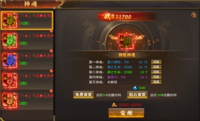 d. 单个神格觉醒后可进行重置神魂等级,免费重置返还50%觉醒消耗,钻石重置(神魂达到10阶出现)返还100%觉醒消耗,单个部位钻石重置次数越多,越低等级开启5条神魂属性的概率越大;